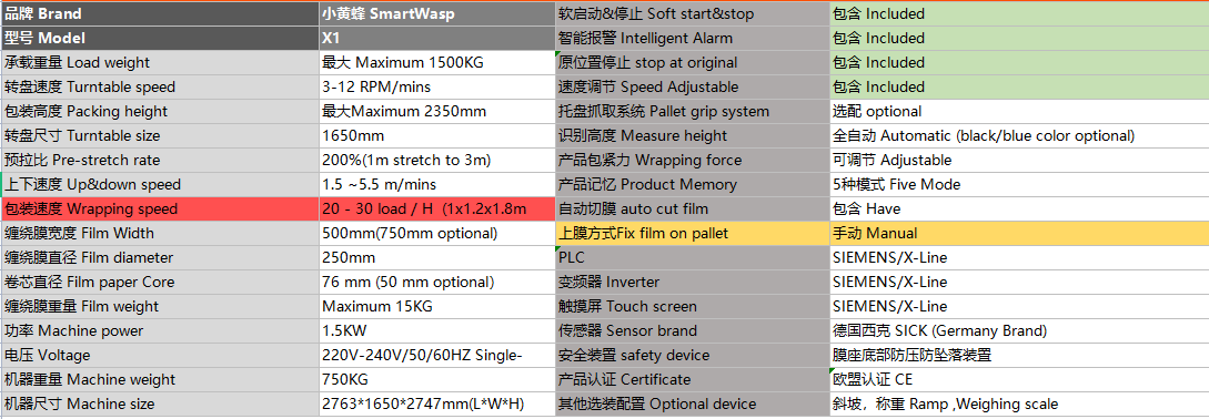 小黃蜂自動(dòng)預(yù)拉式纏繞膜機(jī)X1,堆放在托盤(pán)上的貨物進(jìn)行纏繞包裝,使被包裝物更加穩(wěn)固和整潔,