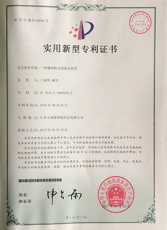 您的位置: 網(wǎng)站首頁(yè) > 榮譽(yù)證書 > 小黃蜂-一種纏繞機(jī)電動(dòng)加壓裝置